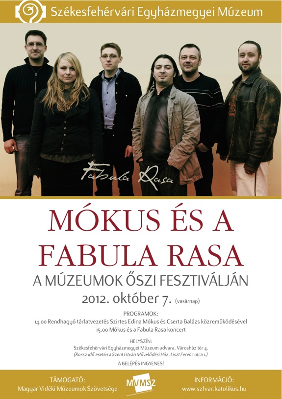 Rendhagyó tárlatvezetéssel és koncerttel örvendezteti meg a fehérváriakat a Mókus és a Fabula Rasa a Múzeumok Õszi Fesztiválja és a Magyar Katolikus Kultúra Napjai programsorozat keretében október 7-én. A Székesfehérvári Egyházmegyei Múzeum udvarán Szirtes Edina Mókus és Cserta Balázs közreműködésével 15 órakor kezdődik a koncert, előtte, 14 órától pedig tárlatvezetés lesz. Rossz idő esetén a Szent István Művelődési Házban lesz a koncert.