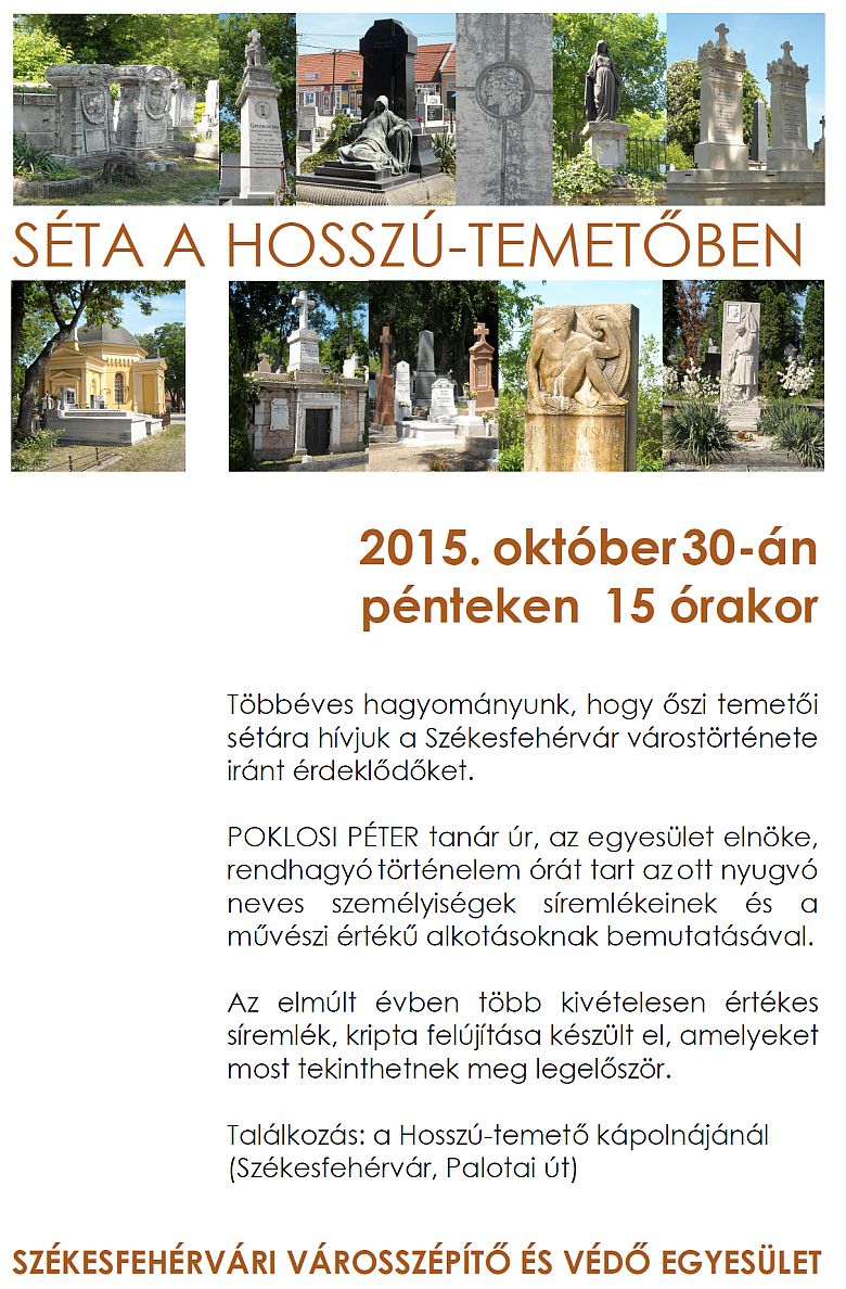 A Hosszú temetőben többek között Székesfehérvár néhai neves közéleti személyiségei, köztük polgármesterek, egyházi személyek, nemesek, főrangú katonák nyugszanak. A Székesfehérvári Városszépítő és Védő Egyesület által szervezett rendhagyó történelemóra során az érdeklődők megismerhetik a személyiségek síremlékeit és a művészi értékű alkotásokat. Az egyesület elnöke, Poklosi Péter beszámol néhány új felfedezésről, kutatási eredményről is. A séta október 30-án, pénteken 15 órakor a sírkert kápolnájától indul, a program – az időjárástól és az érdeklődéstől függően – körülbelül egy-másfél óráig tart majd. Az elmúlt évben több kivételesen értékes síremlék, kripta felújítása készült el, amelyeket most tekinthetnek meg legelőször.