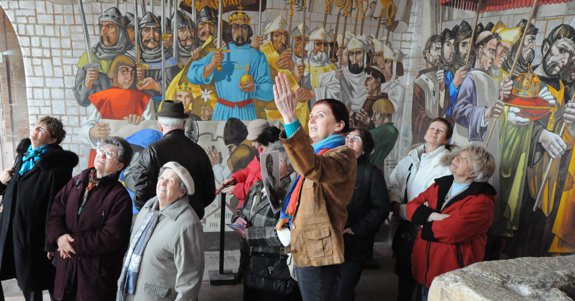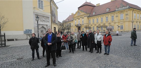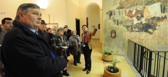 A csoport a majdnem két órás idegenvezetés végén Aba-Novák városházi, az 1938-es emlékév székesfehérvári eseményei bemutató seccóját, és annak eredeti terveit vette szemügyre. A tárlat résztvevők számára különösen izgalmas volt: mindenki lelkesen kereste a tervek és a kész művek közötti különbségeket.