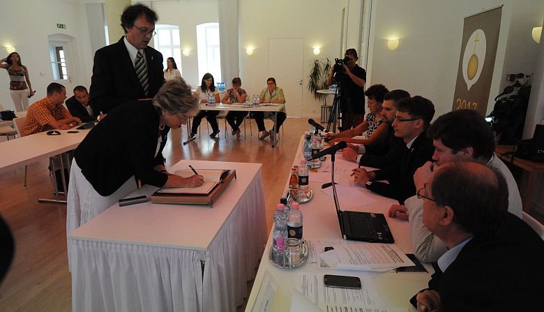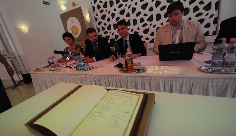 Az időkapszulába kerülő díszes könyvet dr. Csurgai Horváth József, a 2013-as Emlékbizottság elnöke és Percze Ilona az Emlékbizottság titkára írta alá először.