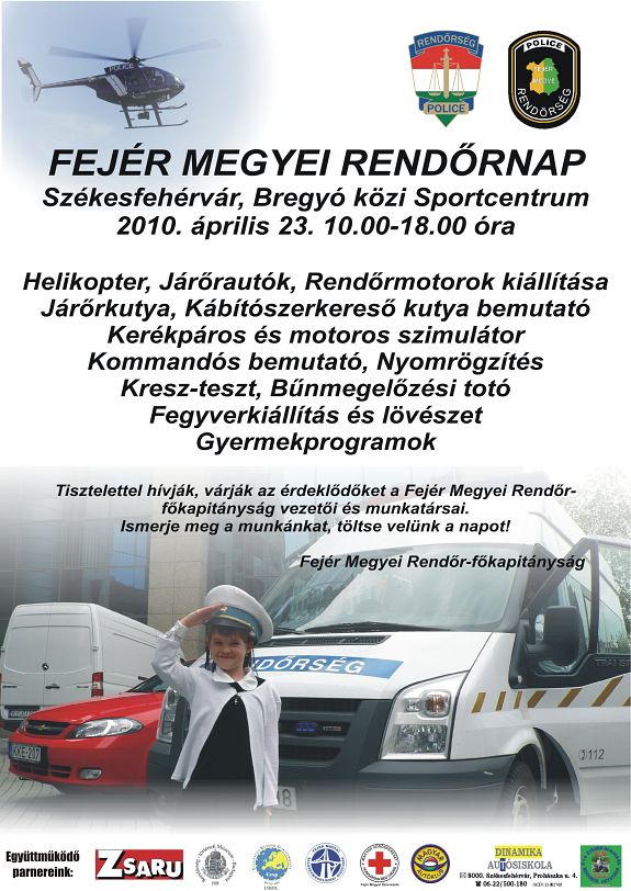 A Fejér Megyei Rendőr- főkapitányság nagyszabású rendőrnapot szervez április 23-án a Bregyó Sportcentrumban. Céljuk, hogy az emberek betekintést nyerjenek a rendőrség munkájába, illetve az általuk használt technikai eszközöket is megismerhessék. Sok programmal köztük helikopteres, rendőrkutyás és kommandós bemutatóval is várják az érdeklődőket, de ott lesz a kapitányság rendőrmotoros szimulátora is, melyet mindenki kipróbálhat.