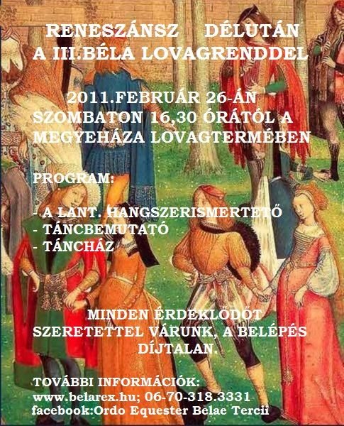 Reneszánsz délutánt szervez a III. Béla Lovagrend február 26-án, szombaton délután a Megyeháza Lovagtermében. A programok között lesz táncbemutató és táncház, de az érdeklődők megismerkedhetnek közelebről is a lanttal. A belépés díjtalan, mindenkit szeretettel vár a lovagrend a hétvégi programon.