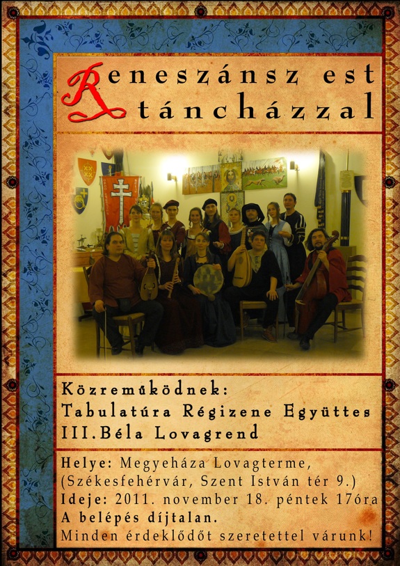 Reneszánsz Estet és Táncházat tartanak november 18-án pénteken 17 órától a Megyeháza Lovagtermében. A rendezvényen közreműködik a Tabulatúra Régizene Együttes és a III. Béla Lovagrend. Az estre, amelynek folyamán lesz koncert, hangszerbemutató, táncbemutató és táncház is, minden érdeklődőt szeretettel várnak.