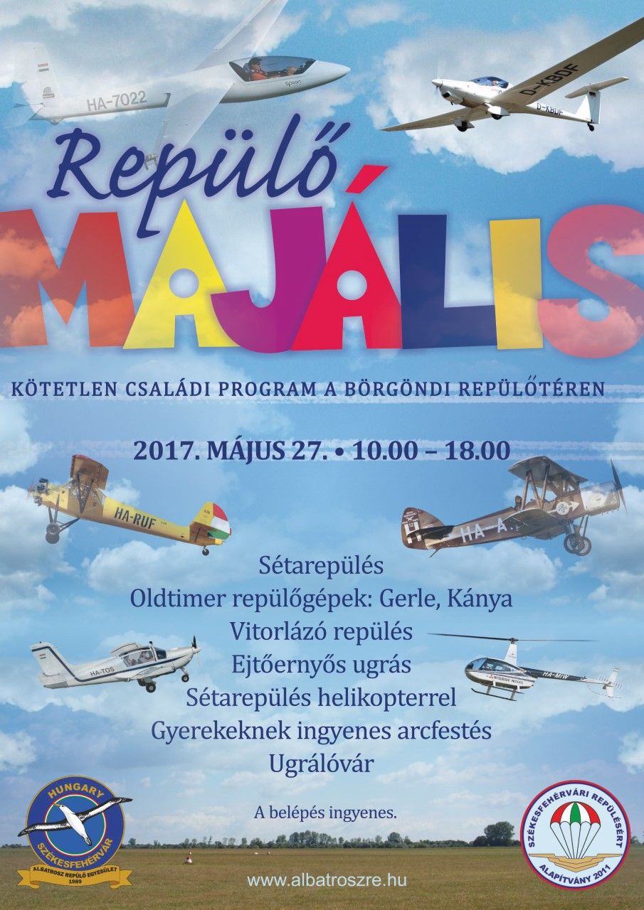 „Évek óta hagyomány már, hogy május végén, a gyereknaphoz kapcsolódva megrendezzük a Repülő Majálist Börgöndön, ahol a Repülőnaphoz hasonlóan a repülőtér nyitva áll a látogatók előtt, akik testközelből nézhetik meg a különböző repülőgépeket.” – vette át a szót Szilády Dezső, az Albatrosz Egyesület elnöke, majd így folytatta: „Az elmúlt esztendőben ünnepelhettük Székesfehérvár repüléstörténetének 100. évfordulóját. Ebből az alkalomból 16 tablóból álló vándorkiállítás készült, a város oktatási intézményeiben repüléstörténeti versenyeket rendeztünk, konferencia és repülőnap is segítette az elmúlt 100 év történetének megismerését.”