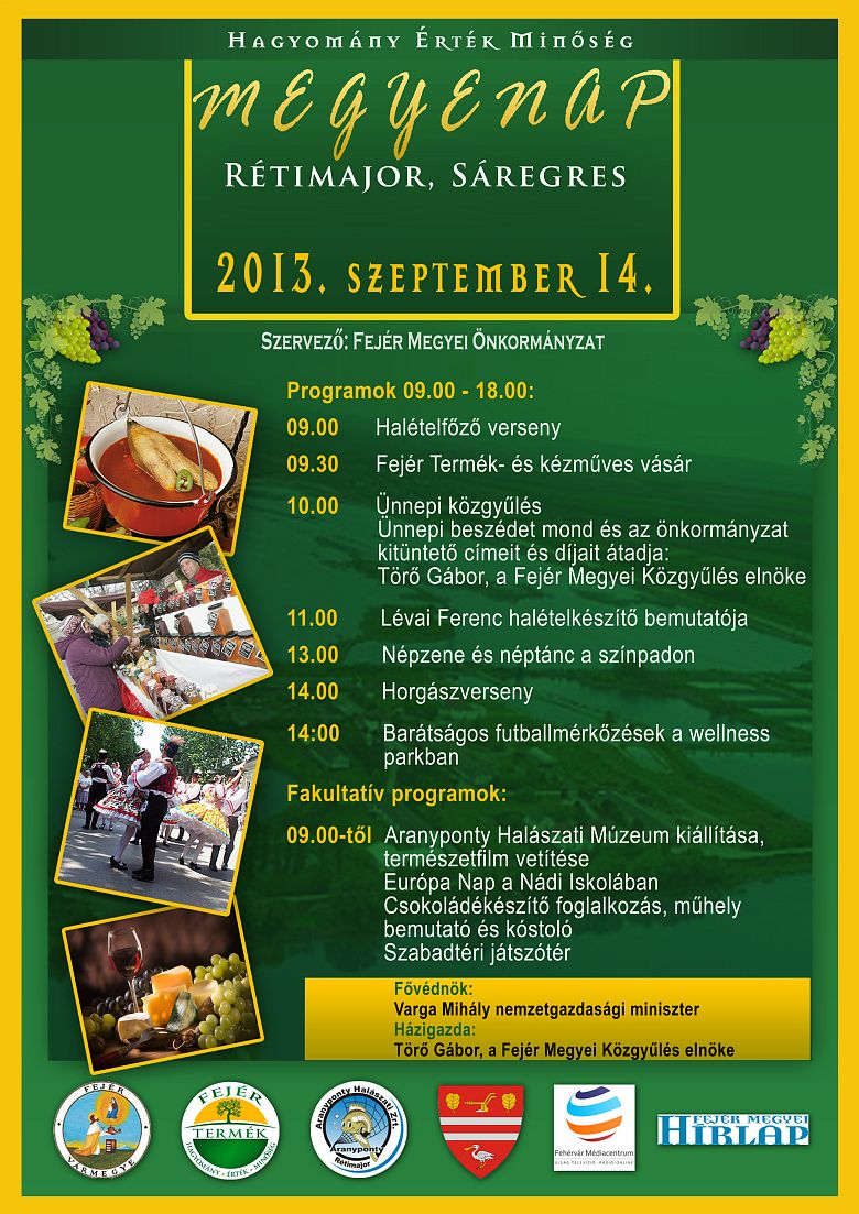 Szeptember 14-én, szombaton Rétimajorban rendezik meg idén a megyenapot. A program célja, hogy bemutassa Fejér megye kulturális értékeit és megismertesse a helyi élelmiszereket és kézműves termékeket. A Megyenapot számos kulturális és szórakoztató program teszi emlékezetessé. A program fővédnöke Varga Mihály nemzetgazdasági miniszter.