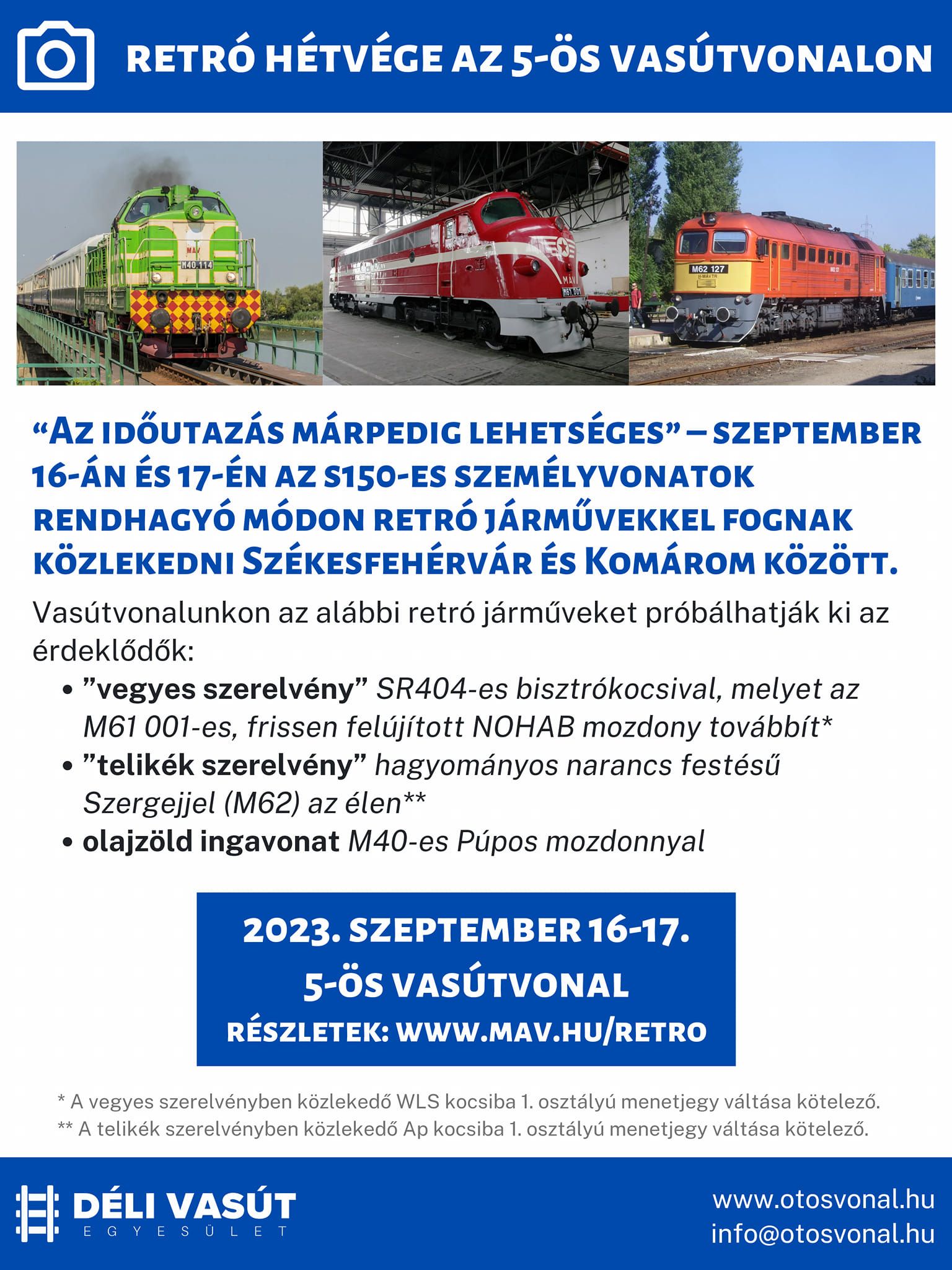 A szeptember 16-17-i hétvégén Székesfehérvár és Komárom között, az 5-ös számú vasútvonalon a közlekedő személyvonatok valamennyi járata retró összeállításban közlekedik. Három különböző szerelvény és mozdony áll forgalomba és ezen a vonalon is közlekedni fog a ”vegyes szerelvény”, melyet az M61 001-es, frissen felújított Nohab mozdony továbbít.