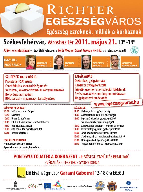 Május 21-én szombaton a Richter Egészségváros Programja zajlik a Városház téren. A helyszínen fitnesz és gyermek-programokkal, színpadi műsorral várják a fiatalokat, felnőtteket és idősebbeket egyaránt. A résztvevők nemcsak saját maguknak tesznek jót, hanem a közösségnek is: a Fejér Megyei Szent György Kórháznak szánt adományalapot a kilátogató lakosok részvételükkel növelik.