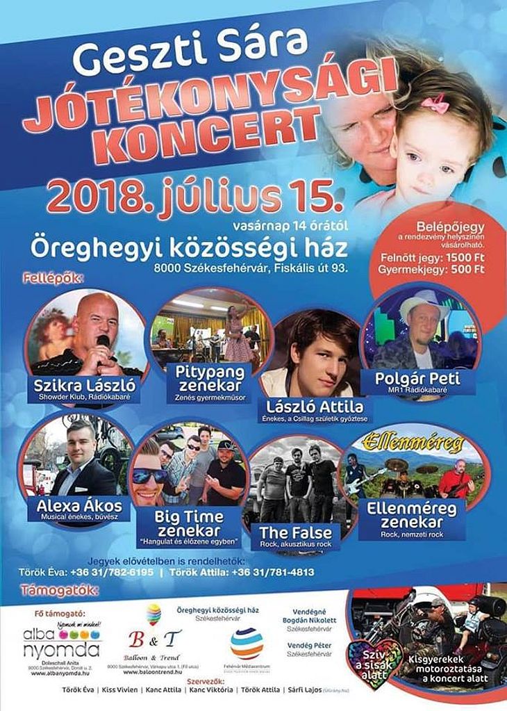 Egy ritka betegségben, az un. Canavan szindrómában szenvedő fehérvári kislány, Geszti Sára javára rendeznek jótékonysági koncertet július 15-én az Öreghegyi Közöségi Házban. A 14 órakor kezdődő eseményen fellép többek között a Pitypang Zenekar, a Big Time Zenekar és a The Fals is.
