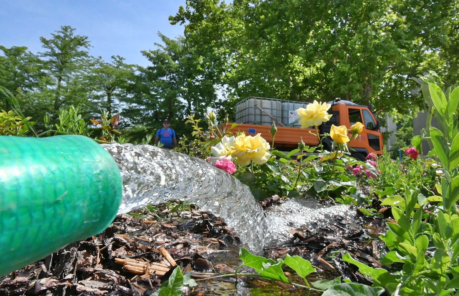 Nemrégiben növényvédelmi kezelést kaptak a Rózsa liget növényei, így árasztással csak a tövüknél öntözik a fiatal rózsákat a nagy melegben.