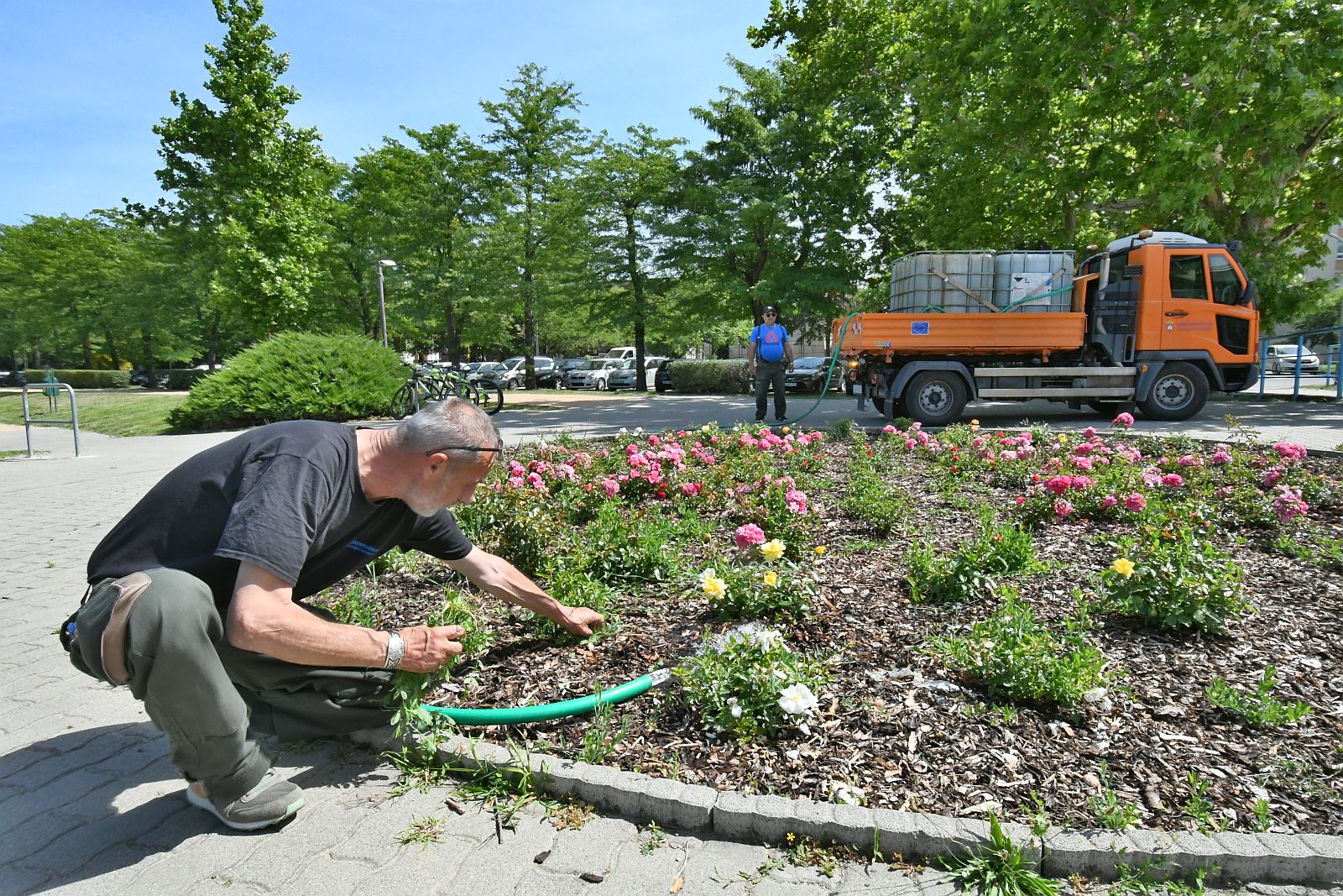 "Mintegy húsz munkatársunk dolgozik felváltva azon, hogy a hőségben öntözzük a fákat és a virágokat Fehérvár közterületein" – mondta Homoki László kertészmérnök a Városgondnokság parkfenntartási divízióvezetője. Mindegyik autón egy sofőr és egy öntözőember dolgozik, aki a tömlőre és a szivattyúra figyel.