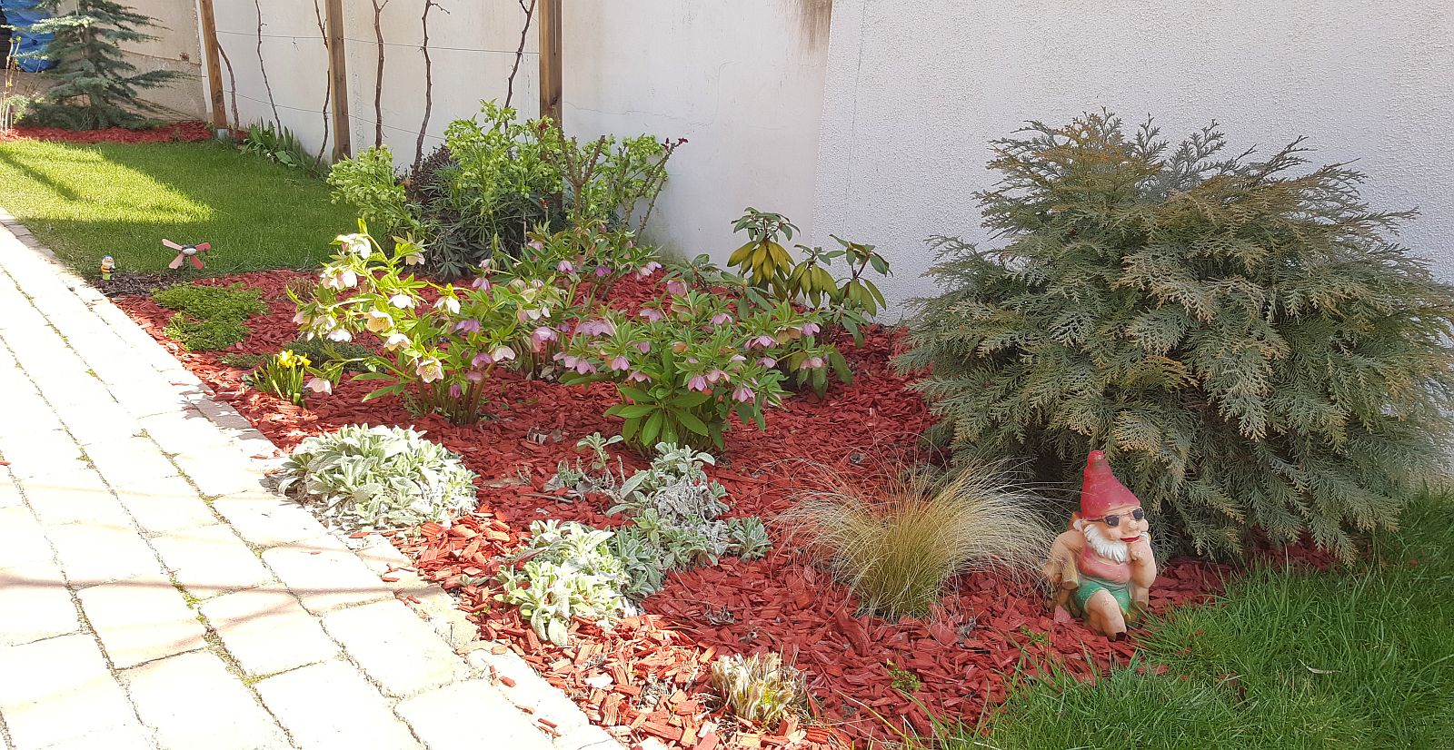 Azt javaslom, hogy a festett, egyszerű faapríték helyett, -ami nem biztos, hogy jót tesz hosszútávon a növényeknek- inkább a természetes fenyőkérget használjuk. Ez általában olcsóbb is, mint a mostanában nagyon divatossá lett festett, kétségtelenül szép dekormulcs.