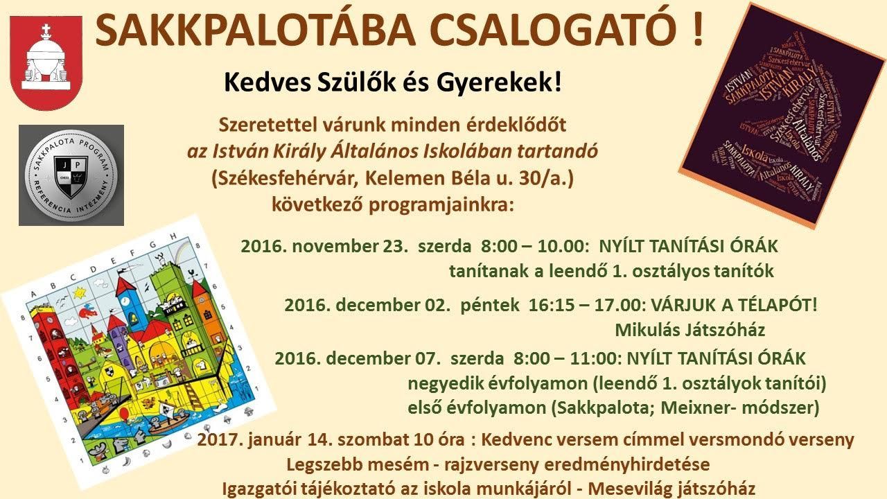 Sakkpalotába csalogató, nyílt tanítási órákat tartanak november 23-án, szerdán az István Király Általános Iskolában. A leendő első osztályos tanító nénik 8 és 10 óra között várják a nagycsoportos óvodásokat és szüleiket. December 2-án Mikulás játszóházzal folytatódik az intézmény idei programsorozata, majd december 7-én, szerdán 8 és 11 óra között újabb nyílt órák lesznek, ezúttal a negyedik és az első évfolyamon.