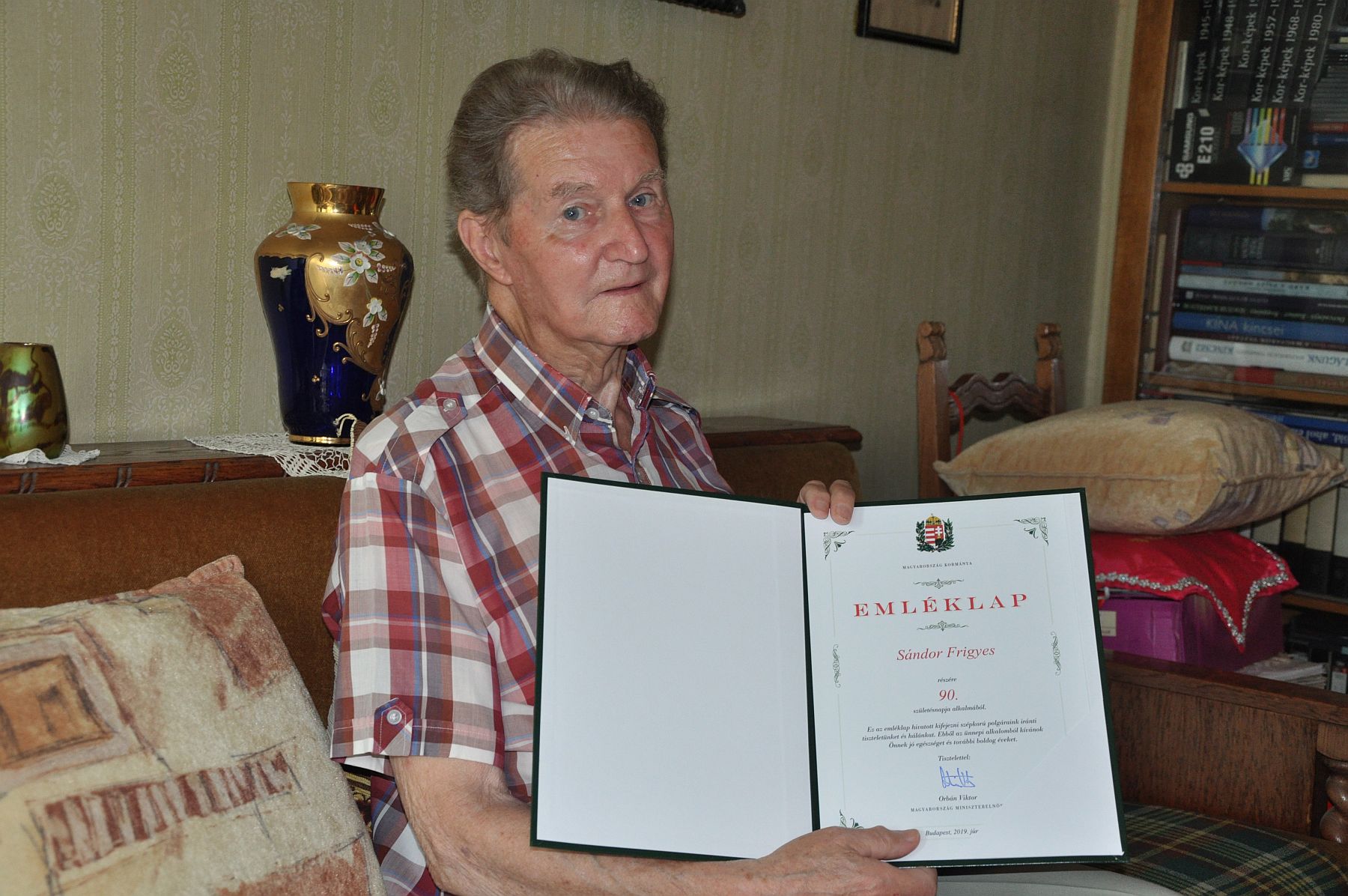 A 90 esztendős Sándor Frigyes tanító úrnak Deák Lajosné, a körzet önkormányzati képviselője adta át a Magyarország miniszterelnökének aláírásával ellenjegyzett emléklapot, valamint a város ajándékát.