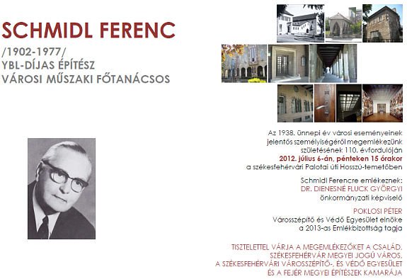 Schmidl Ferenc Ybl-díjas építészre, egykori városi műszaki főtanácsosra emlékeznek 110. születésnapján július 6-án, pénteken 15 órakor. Az 1938-as ünnepi év eseményeinek jelentős személyiségéről a megemlékezés a Palotai úti Hosszú temetőben lesz, melyen részt vesz dr. Dienesné Fluck Györgyi önkormányzati képviselő és Poklosi Péter a Városszépítő és Védő Egyesület elnöke, a 2013-as emlékbizottságtagja. Ott lesz még a népes 4 generációs család is, közöttük Schmidl Ferenc lánya, a 81 éves Márta néni, kislányként 1938-ban ő adta át a hivatalos virágcsokrot a fehérvári ünnepségre érkező kormányzónénak, illetve Schmidl Ferenc fia, aki Kölnben építész.