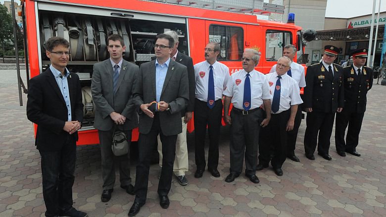 Szerdán délelőtt az Alba Pláza előtt dr. Joachim Bläse Schwäbisch Gmünd alpolgármestere, Székesfehérvár Tiszteletbeli polgára adta át a Fehérvári Tűzoltó Egyesület vezetőjének Varga Lajosnak annak a tűzoltóautónak a kulcsát, amit testvérvárosunktól kapott az egyesület. Az átadáson Cser-Palkovics András Fehérvár polgármestere is köszönetet mondott az autóért, mely gondos, jó kezekbe kerül a városban.