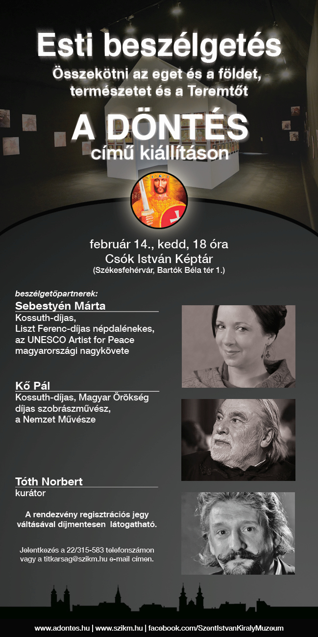 Február 14-én, kedden este hat órakor lesz az első beszélgetős est A DÖNTÉS című kiállításon, melyen Sebestyén Mártával, Kő Pállal és Tóth Norberttel beszélget Vakler Lajos. A minap Jankovics Macell forgatott stábjával a kiállításon, ami visszaköszön majd a Kossuth-díjas rendező filmsorozatában is. A keddi beszélgetés ingyenes, de a Csók István Képtár befogadóképessége miatt regisztrálni kell a 22/315-583-as telefonszámon.