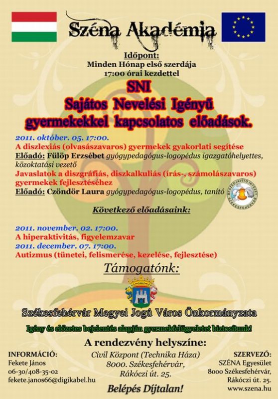 A sajátos nevelési igényű (SNI) gyermekkel kapcsolatos előadássokat szervez a SZÉNA Egyesület a Széna Akadémia programsorozat keretében. Az eseményeket minden hónap első szerdáján rendezik meg a Fehérvári Civil Központban, egy-egy témával három különböző előadáson foglalkoznak. A kezdeményezés azon szülőknek, pedagógusoknak, szakembereknek nyújt segítséget, akik szeretnének bővebben tájékozódni a betegségekkel kapcsolatos tudnivalókról, lehetőségekről.
