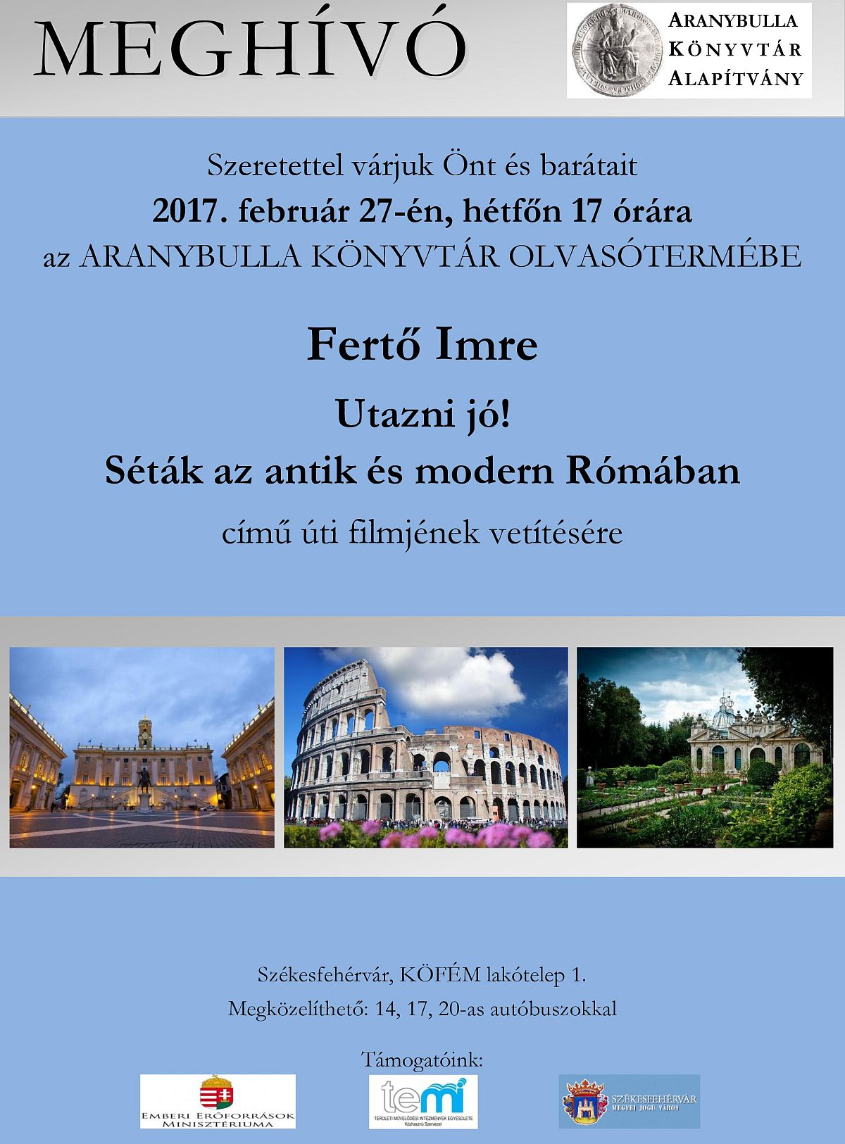 Hétfőn délután 17 órakor kezdődik az Aranybulla Könyvtár Olvasó- termében Fertő Imre Utazni jó! Séták az antik és a modern Rómában című útifilmjének vetítése. A mű segítségével az Örök Város legszebb helyeit, többek között a Colosseumot és a Trevi-kutat is megcsodálhatjuk. A hétfő délutáni kulturális programra sok szeretettel várnak minden érdeklődőt!