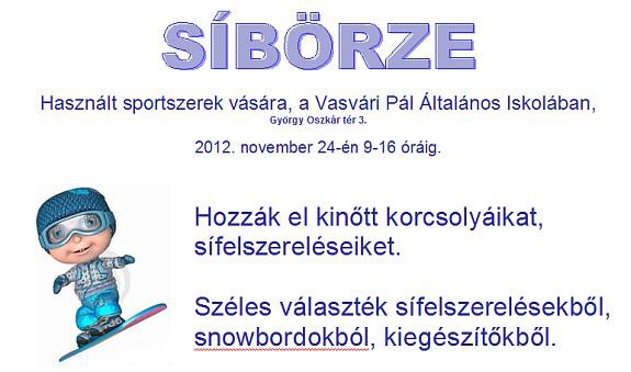 Használt sportszerek, kinőtt korcsolyák, sí- és snowboard felszerelések lesznek eladóak november 24-én, 9-16 óráig a Vaspári Pál Általános Iskolában. A Síbörzén a téli sportok kedvelői és a kezdők is találnak maguknak termékeket, kiegészítőket a hamarosan induló szezonra, a György Oszkár tér 3. szám alatt.