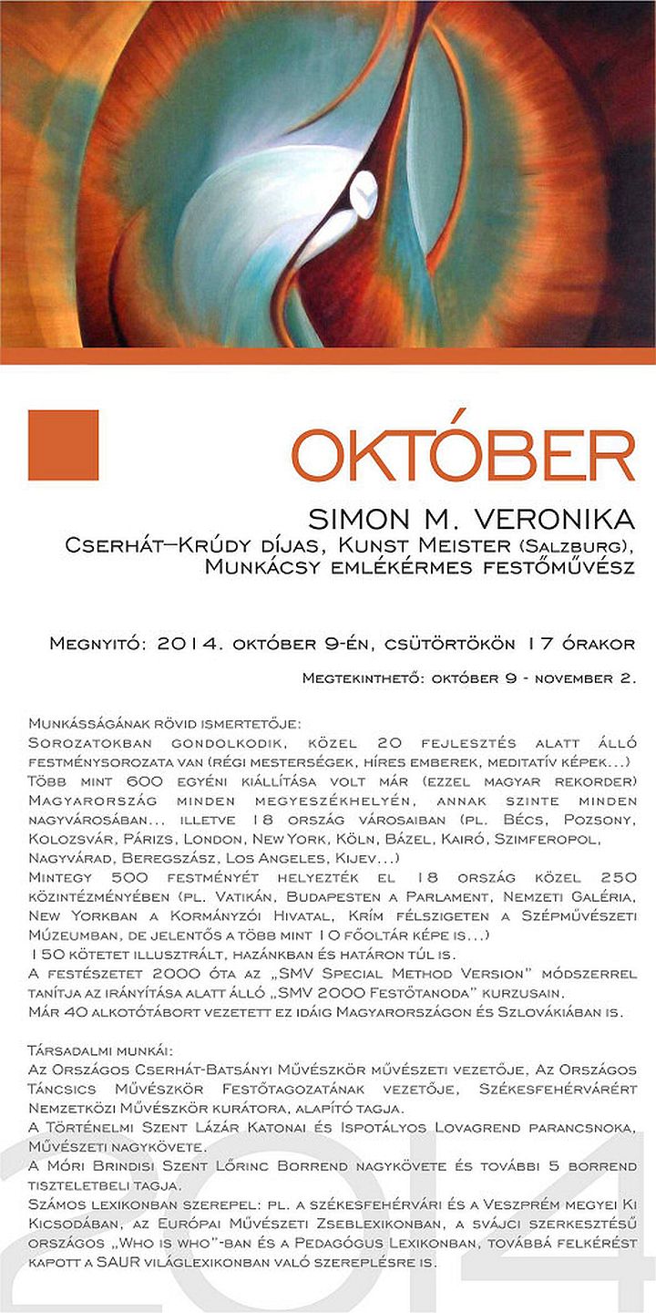 Simon M. Veronika festőművész alkotásaiból nyílik kiállítás október 9-én, csütörtökön 17 órakor a Művészetek Háza kiállítótermében. A november 2-ig látogatható tárlatot Enyedi Béla szépíró ajánlja a közönség figyelmébe, a kiállítás november 2-ig látható.