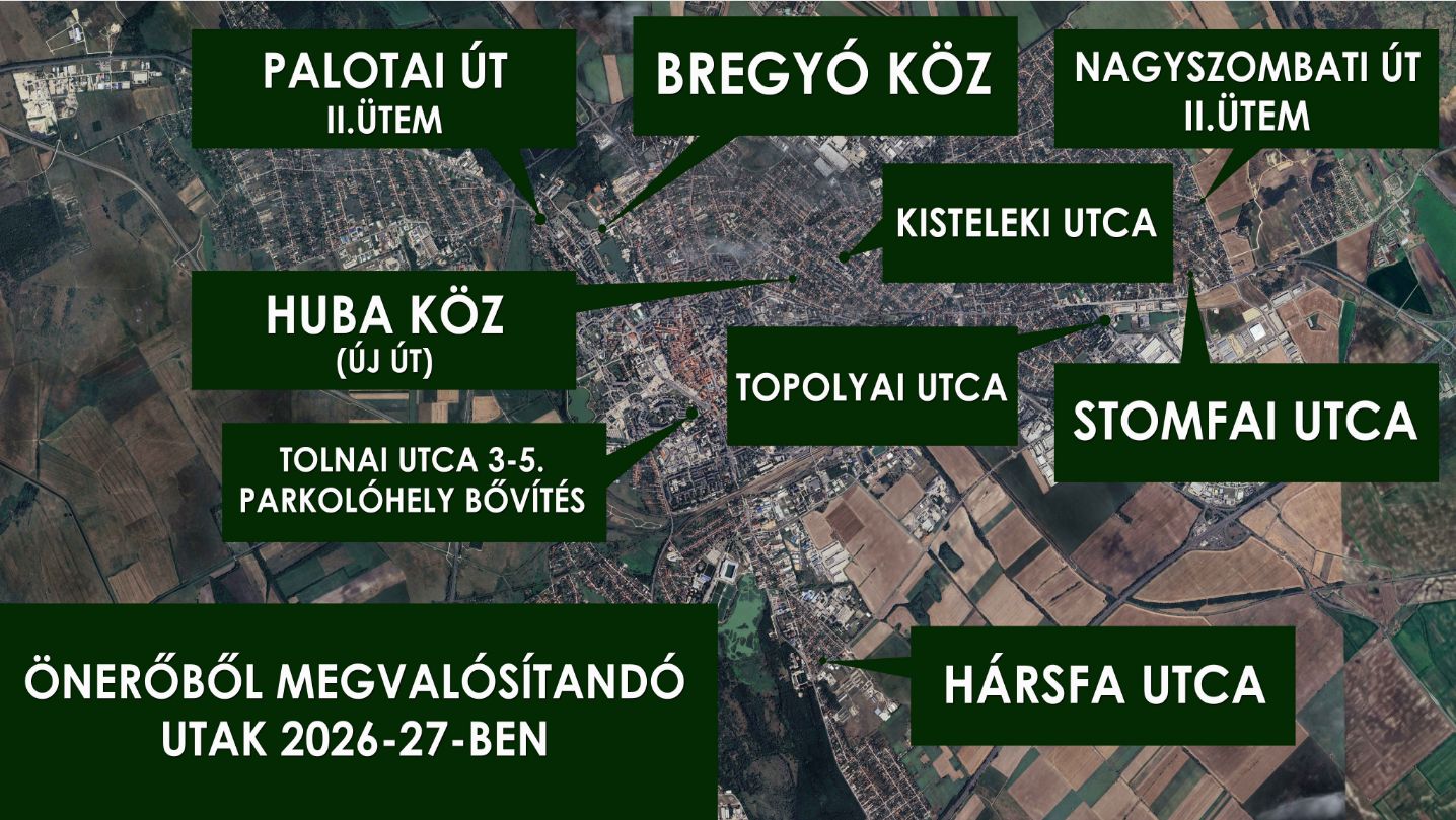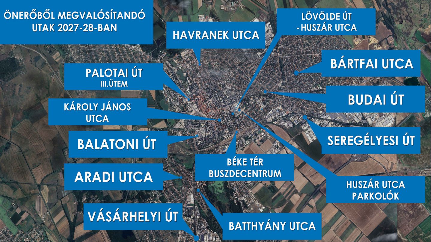 Városi forrásból 2027-28-ban megvalósításra tervezett útberuházások (költségvetéstervezetben szereplő gyűjtőutak és lakóövezeti utcák, összesen kb. 2 milliárd Ft értékben):