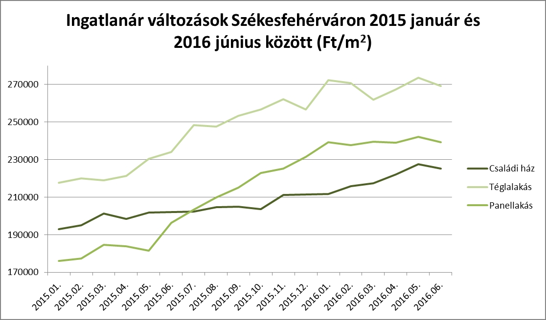 Egyetlen év alatt az eladó székesfehérvári lakások átlagos négyzetméter ára látványosan, 25-36%-kal emelkedett, a családi házak átlagos négyzetméterenkénti árai ennél jóval visszafogottabban, mintegy 9,5%-kal növekedtek egy év alatt. 2016 január és május között országos szinten lényegesen mérsékeltebb, 5-6%-os változás mutatkozott, ami Székesfehérváron is megfigyelhető volt: a családi házak 6%-kal drágultak, a téglalakások átlagos Ft/m2 árai 1%-kal csökkentek, a panellakások átlagárai stagnáltak.