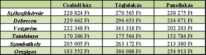 A családi házak 25%-kal drágábban, a téglaépítésű lakások 3%-kal, a panellakások pedig 7%-kal olcsóbban érhetőek el Székesfehérváron az országos átlaghoz képest. A városban elérhető ingatlanok Tatabánya és Szombathely árainál 10-54%-kal drágábbak, a Veszprémben és Debrecenben tapasztalható árszínvonallal pedig közel megegyező szinten vannak.