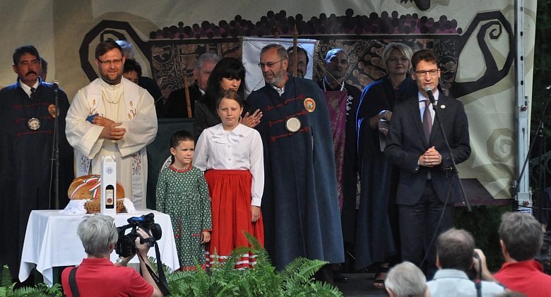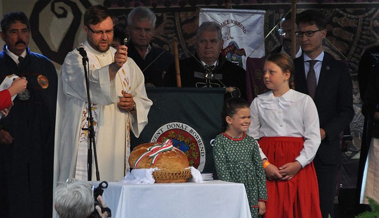 A köszöntőket követően Tornyai Gábor, az Öreghegyi Egyházközség plébánosa áldotta meg az új kenyeret és a bort. A hálaadó imádságok mellett személyes gondolatait is tolmácsolta a jelenlévők számára. „A mai napon azt ünnepeljük, hogy van miért hálát adnunk, hogy van kenyerünk, borunk, van mit ennünk és innunk. Nehézségeink, gondjaink mellett vannak olyan alkalmak is, amikor tudunk vidámak lenni…Fontos, hogy ezeket az alkalmakat, az öröm, a hálaadás és a vidámság idejét újra és újra megtaláljuk magunknak, és ezt meg is tudjuk köszönni! Szent István ünnepe is hálaadás kell, hogy legyen mindannyiunk számára, hogy megköszönjük Istennek mindazt, amit tőle kaptunk.”