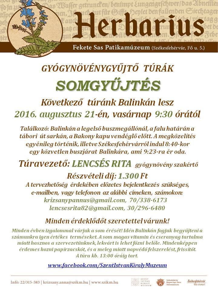 Somgyűjtésre várják az érdeklődőket vasárnap Balinkán a Herbarius programok keretében. A C-vitaminban dús gyümölcsből lekvárt és szörpöt is lehet készíteni, vagy eltartható akár aszalva is. A Fekete Sas Patikamúzeum gyógynövénygyűjtő Herbarius túráját ezúttal is Lencsés Rita vezeti. A programra előzetes bejelentkezés szükséges!