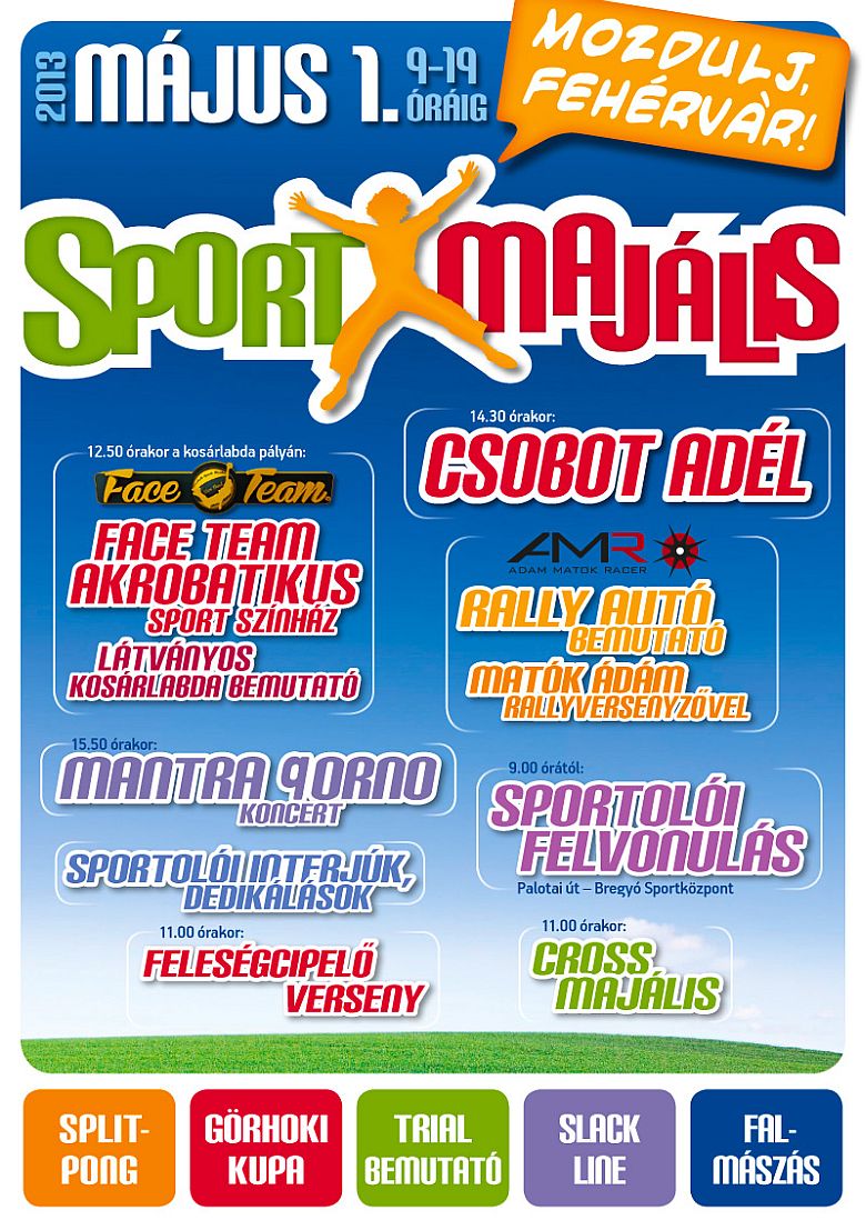 Idén harmadszor a sport jegyében zajlik a székesfehérvári Majális a Bregyó Sportcentrumban. A program látványos és több száz sportolót megmozgató felvonulással kezdődik, melynek élén Matók Ádám adja meg a jelet az indulásra új autójával, egy Honda Civic R3-mal. A versenyautót később a Bregyó Sportközpontban közelről is megcsodálhatják az érdeklődők. Május 1-jén mindenki találkozhat a fehérvári kedvencekkel, akik közös játékkal és dedikálással is készülnek.