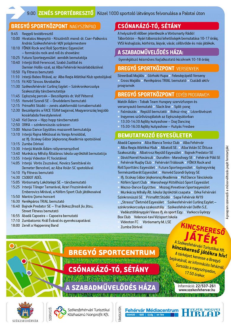 A város sportegyesületei különböző aktivizáló programokkal, ügyességi versenyekkel igyekeznek bevonni a látogatókat, és bemutatni a sportágat, amelyet képviselnek. Lesz falmászás, slackline, lézerlövészet, boxring és küzdősportok. A rendezvényen lesz még Triál kerékpáros bemutató, Agility kutyashow, egész napos színpadi program – benne Csobot Adél és utcabál este a Happening Band-el -, valamint hamisítatlan majális hangulat a Csónakázótó partján, melyet a Vörösmarty Rádió Panoráma Stúdiójából élőben közvetítenek..