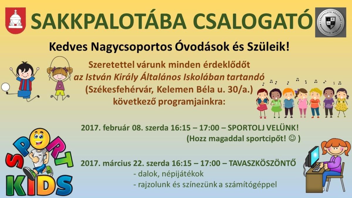 Újra szervez Sakkpalotába csalogató programokat a Székesfehérvári István Király Általános Iskola. Február 8-án, szerdán 16.15-17.00 óra között sportos, mozgásos délutánra várják a nagycsoportos óvodásokat. Fontos, hogy a gyerekek hozzanak magukkal tornacipőt a foglalkozásra. A sorozat ezután március 22-én, szerdán, ugyancsak 16.15 órától folytatódik. Ekkor már a tavaszt köszöntik a résztvevők zenével, népi játékokkal, sőt, rajzolás és színezés is szerepel a programban.