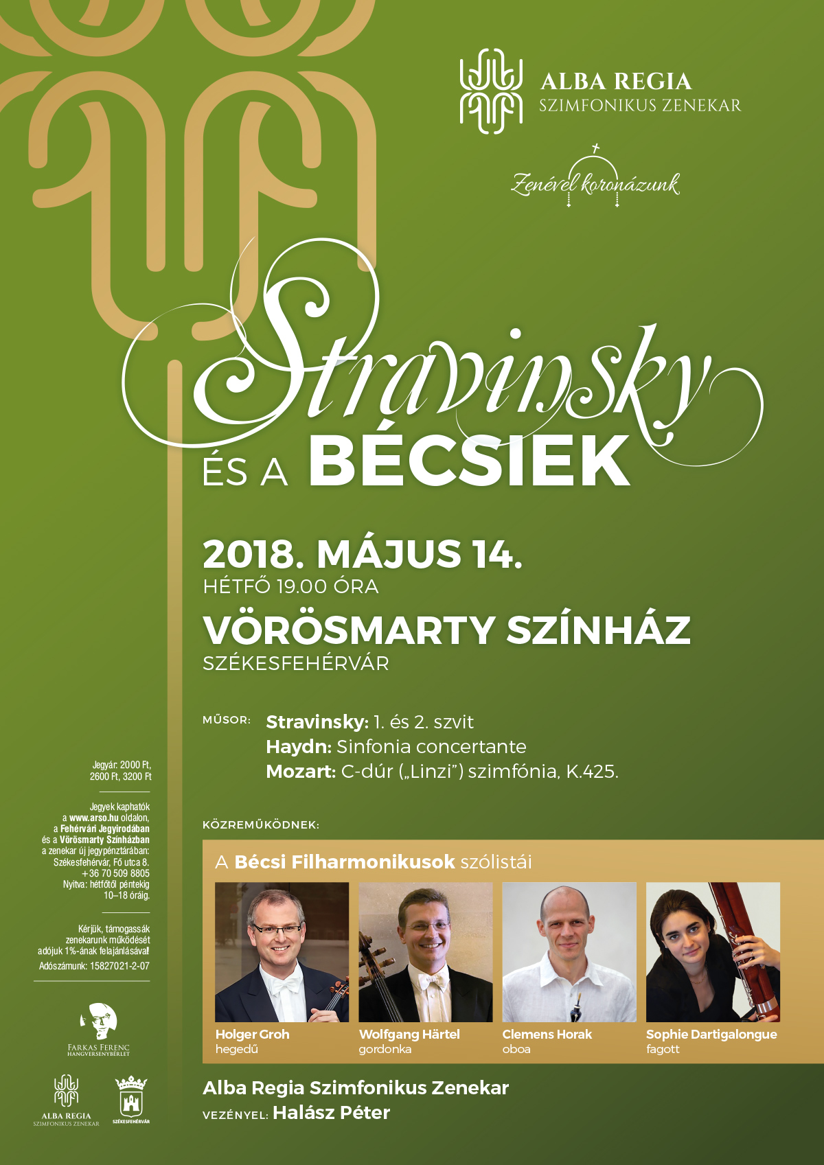 Az Alba Regia Szimfonikus Zenekar idei Farkas Ferenc Hangversenybérletének befejező koncertje 2018. május 14-én este lesz a Vörösmarty Színházban, Stravinsky és a bécsiek címmel.