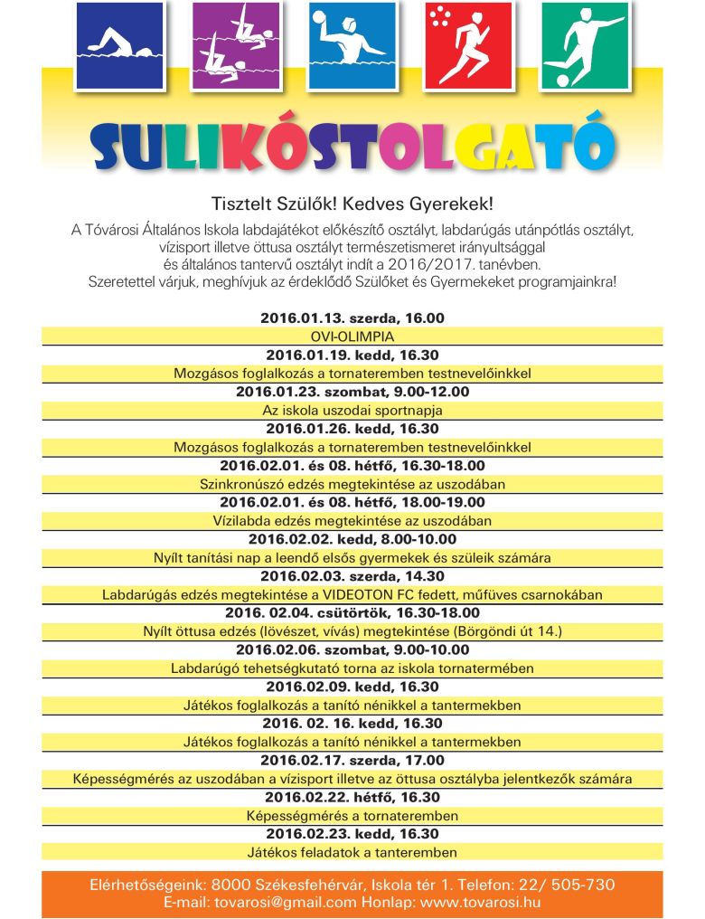 Sportos programokkal várják a nagycsoportos óvodásokat és szüleiket a Tóvárosi Általános Iskolába. A játékos, mozgásos foglalkozások mellett képességfelmérés is lesz. A leendő elsősök és családtagjaik a nyílt napokon megismerhetik az iskola nevelési-oktatási programját és a tanítókat is. Kedden délután, 16.30-tól mozgásos foglalkozásra várják az érdeklődőket.