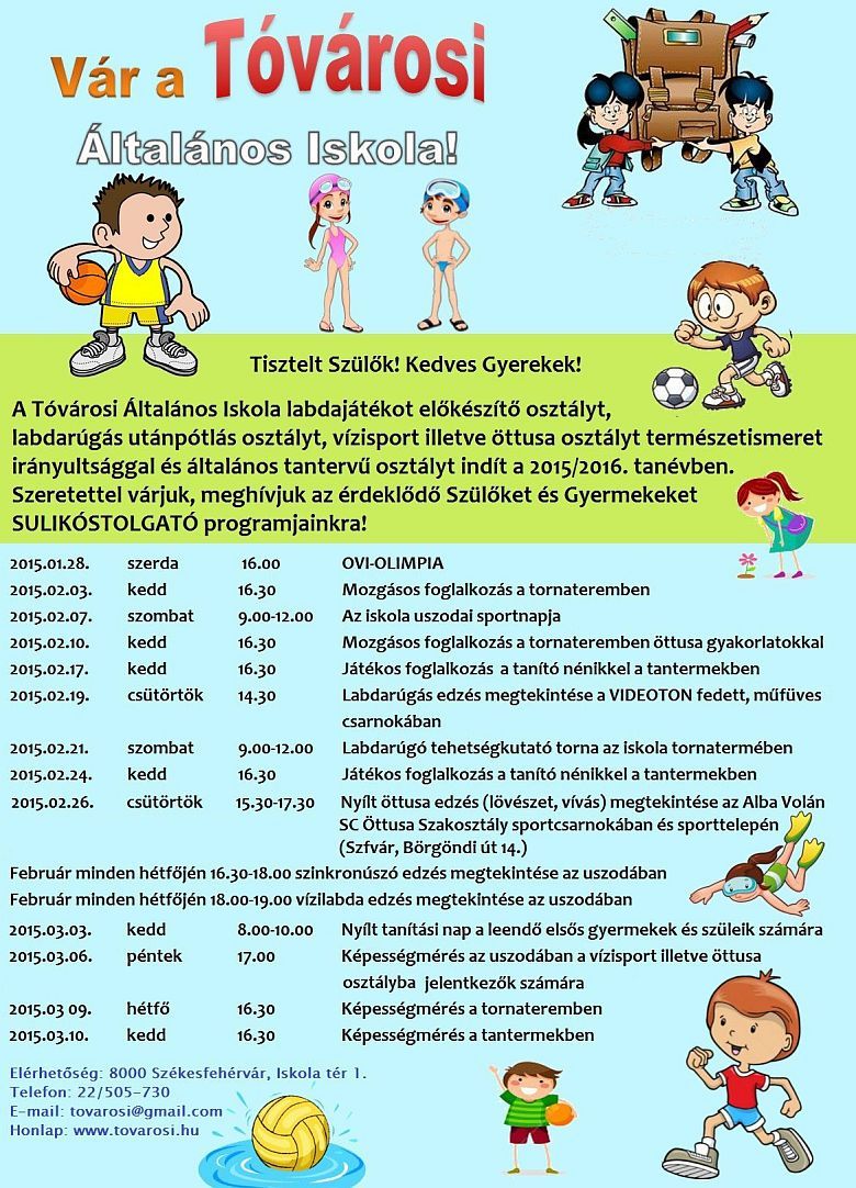 Sportos programokkal várják a nagycsoportos óvodásokat és szüleiket a Tóvárosi Általános Iskolába. A játékos, mozgásos foglalkozások mellett képességfelmérés is lesz. A leendő elsősök és családtagjaik a nyílt napokon megismerhetik az iskola nevelési-oktatási programját és a tanítókat is. Kedden délután, 16.30-tól a Sulikóstolgató program keretében játékos foglalkozásra várják a nagycsoportos óvodásokat a tanító nénik.
