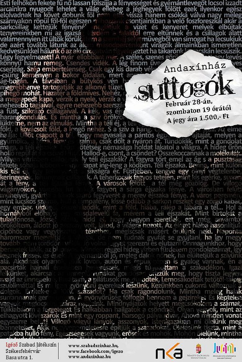 2015. február 28-án, szombaton este az Andaxínház jóvoltából tekinthetik meg az érdeklődők a Suttogók című darabot a székesfehérvári Igézőben (Basa utca 1.). Zsalakovics Anikó koncepciója alapján Jászberényi Gábor, Hajduk Károly, Kroó Balázs és Czitrom Ádám szerepel előadóként a darabban. A kulturális program szombaton este 19 órakor kezdődik.