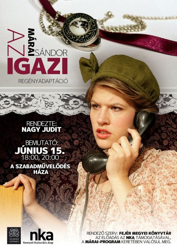 Minden érdeklődőt szeretettel várnak a Szabad Színház színészei június 15-én a Szabadművelődés Házába, ahol Az igazi című darabot mutatja be a társulat, Nagy Judit rendezésében. Két előadás lesz péntekem este 6-kor és 8-kor. Szombaton a Szabadművelődés Házában Vaclav Havel: Audiencia című darabját este 7 órakor, a Fekete Sas Patikamúzeumban Lázár Ervin A Csodapatika című meseadoptációját pedig 8 órakor láthatják az érdeklődők.
