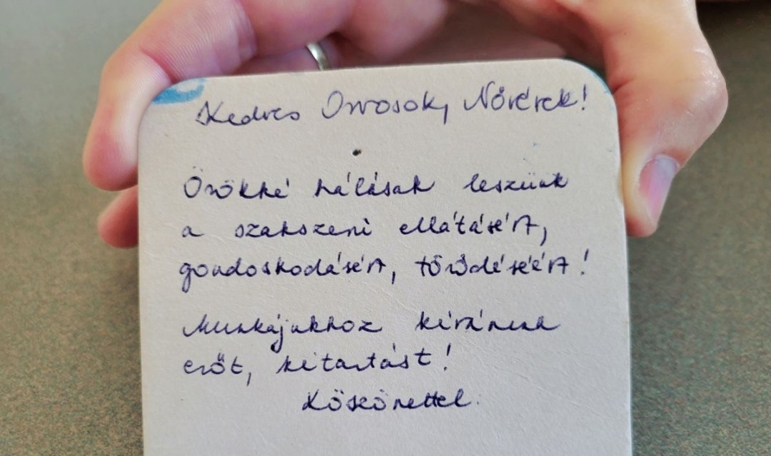Kedves üzenettel búcsúzott a család tőlük, ráadásul Éva egy karkötőt is kapott a kislányoktól – rajta egy angyalkával. Ez a medál élete végééig emlékeztetni fogja őt arra a bizonyos napra és bizonyítja, hogy Angyalok – néha ápolónak „álcázva” – igenis léteznek!