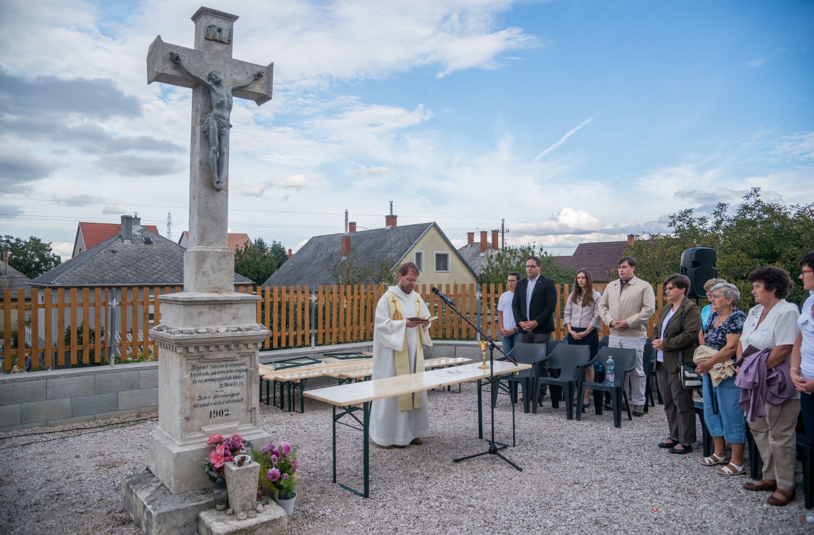 A misét Matusz Hugó bencés atya celebrálta, aki szentbeszédében kiemelte, a keresztények számára a kereszt egy szívbéli hely. "A kereszt az a hely, amelyhez odajárulunk a megváltás szimbólumaként és egyben az a virtuális tér, amiben lépünk. Ez az a tér, ahol Krisztus meghal értünk és feltámad és ahol igazán fontossá váltunk számára és fontossá vált minden generáció. Jézus a kereszten váltott meg minket és amikor idejövünk, osztozunk minden ember sorsában, akik a megváltót látják a keresztben." - fogalmazott Matusz Hugó bencés atya, aki szólt arról is, hogy a Szőlő utcai kereszt környékének gondozottságán is látszik, hogy mennyire fontos ez a tér a helyi közösségnek.