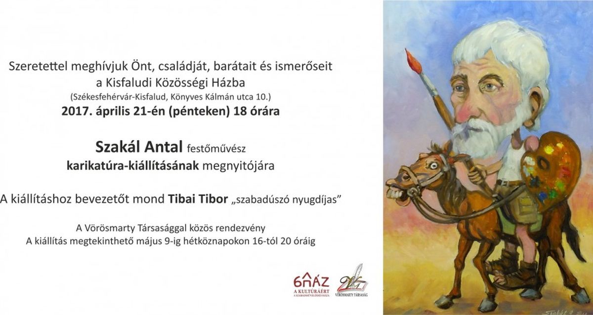 Szakál Antal festőművésztől - akinek festményein túl kisplasztikái és domborművei is igen jól ismertek a fehérváriak előtt - most ilyen alkotásokat tekinthetünk meg. Karikatúra-kiállítása a Kisfaludi Közösségi Házban április 21-én, pénteken 18 órakor nyílik meg. Az eseményen bevezetőt mond Tibai Tibor “szabadúszó nyugdíjas”. A tárlat május 9-ig hétköznapokon 16-20 óráig tekinthető meg. Minden művészet iránt érdeklődőt szeretettel várnak!