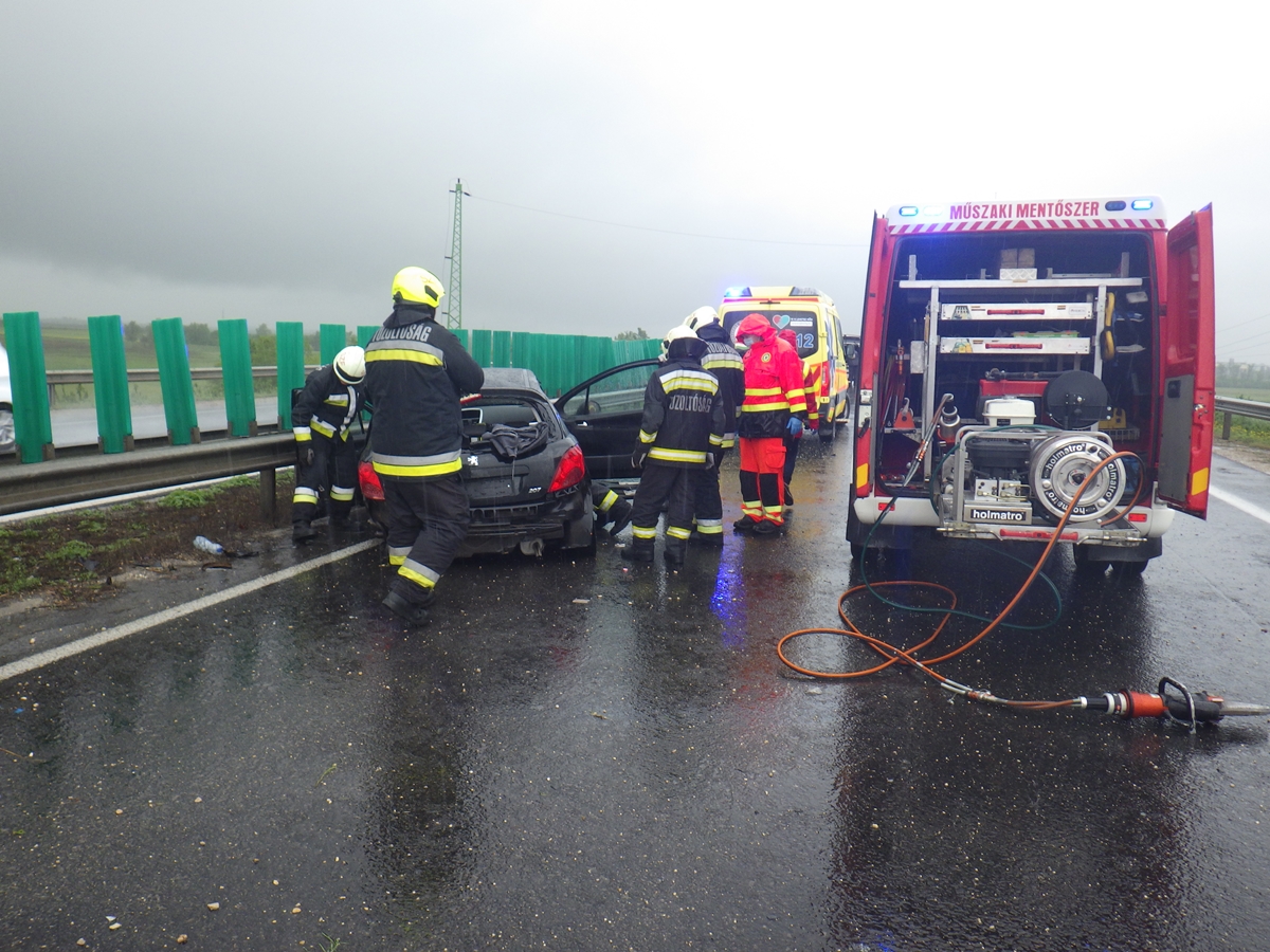 Megcsúszott a vizes burkolaton és szalagkorlátnak ütközött egy személygépkocsi május 17-én délelőtt a 7-es és a 8-as főút Székesfehérvárt elkerülő, közös szakaszán. Az autóban ketten ültek, a sofőr ki tudott szállni a járműből. A megyeszékhely hivatásos tűzoltói feszítővágóval távolították el a gépkocsi hátsó ajtaját és középső merevítő oszlopát, majd a mentőkkel közösen emelték ki az utast a járműből.