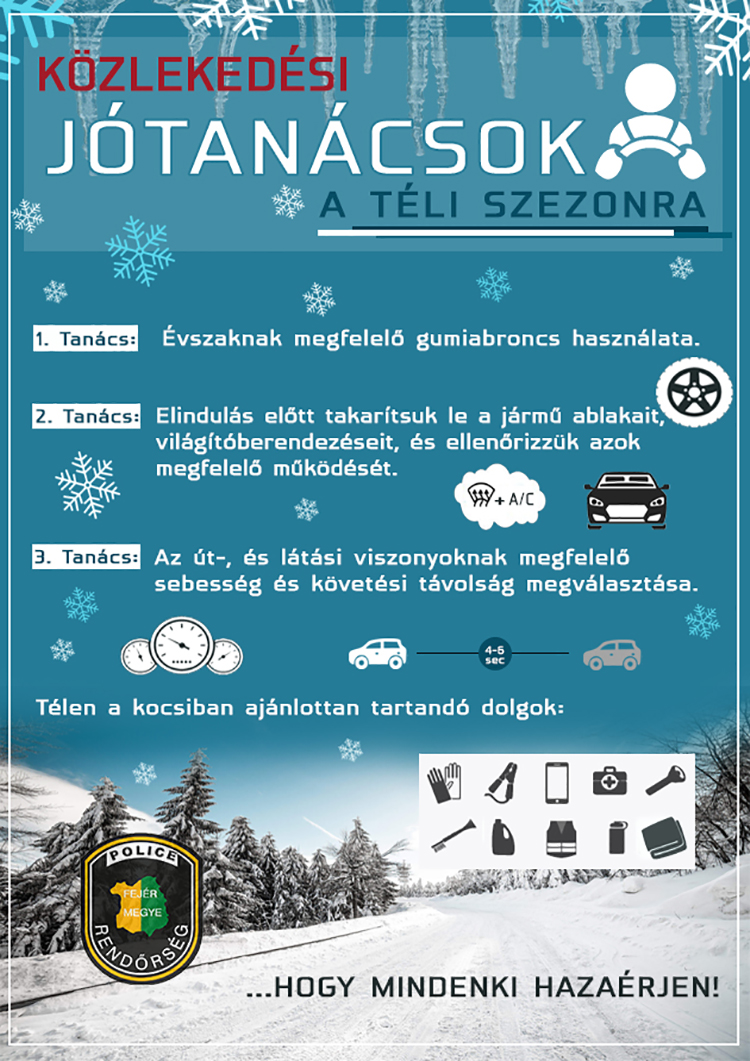 "Legyen tisztában azzal, hogy téli vezetési körülmények között az autó féktávolsága jelentősen megnő, ezért kérjük, tartson nagyobb követési távolságot az ön előtt közlekedő járműtől!" - tanácsolja a Fejér Megyei Rendőr-főkapitányság.