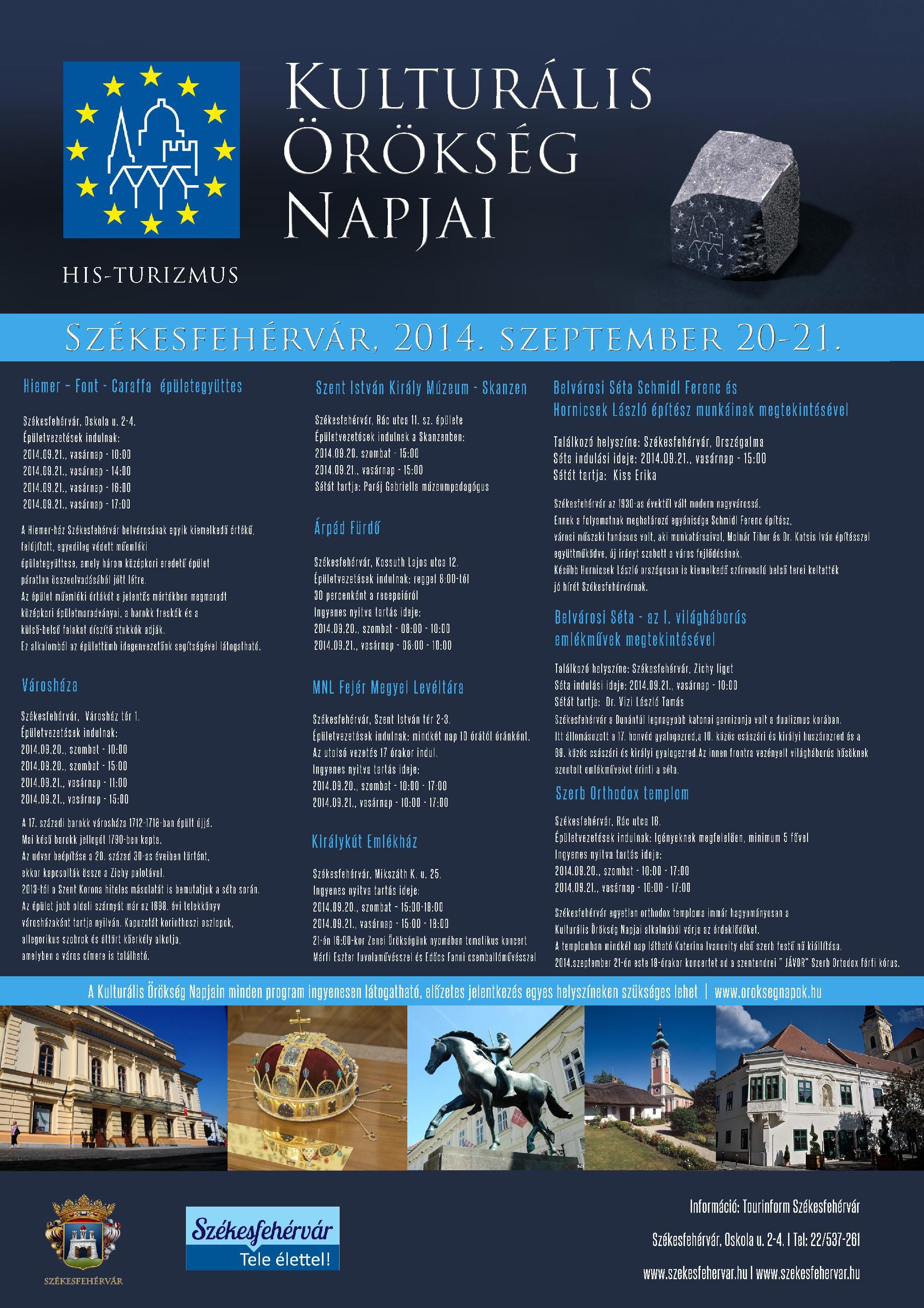 Brájer Éva alpolgármester elmondta, örül annak, hogy a Múzeumok Éjszakája programsorozathoz hasonlóan évről évre többen csatlakoznak a Kulturális Örökség Napjai fehérvári programjaihoz. "Szándékunk, hogy hasonló sikereket érjünk el, mint a Múzeumok Éjszakájával." - emelte ki Székesfehérvár alpolgármestere, aki szólt arról is, hogy a hétvégén a bőség zavarával küszködünk majd Fehérváron, többek között a Lecsófőző Vigasságokat is ezen a hétvégén rendezik meg. A fehérváriaknak azt tanácsolta, hogy próbáljanak meg hatékony időbeosztással minál több programon résztvenni. Elmondta, hogy a Kulturális Örökség Napjain az első világháború kitörésének centenáriumára is emlékezünk, a város első világháborús emlékműveit egy sétával tisztelik meg, dr. Vizi László Tamás történész szakmai vezetésével.