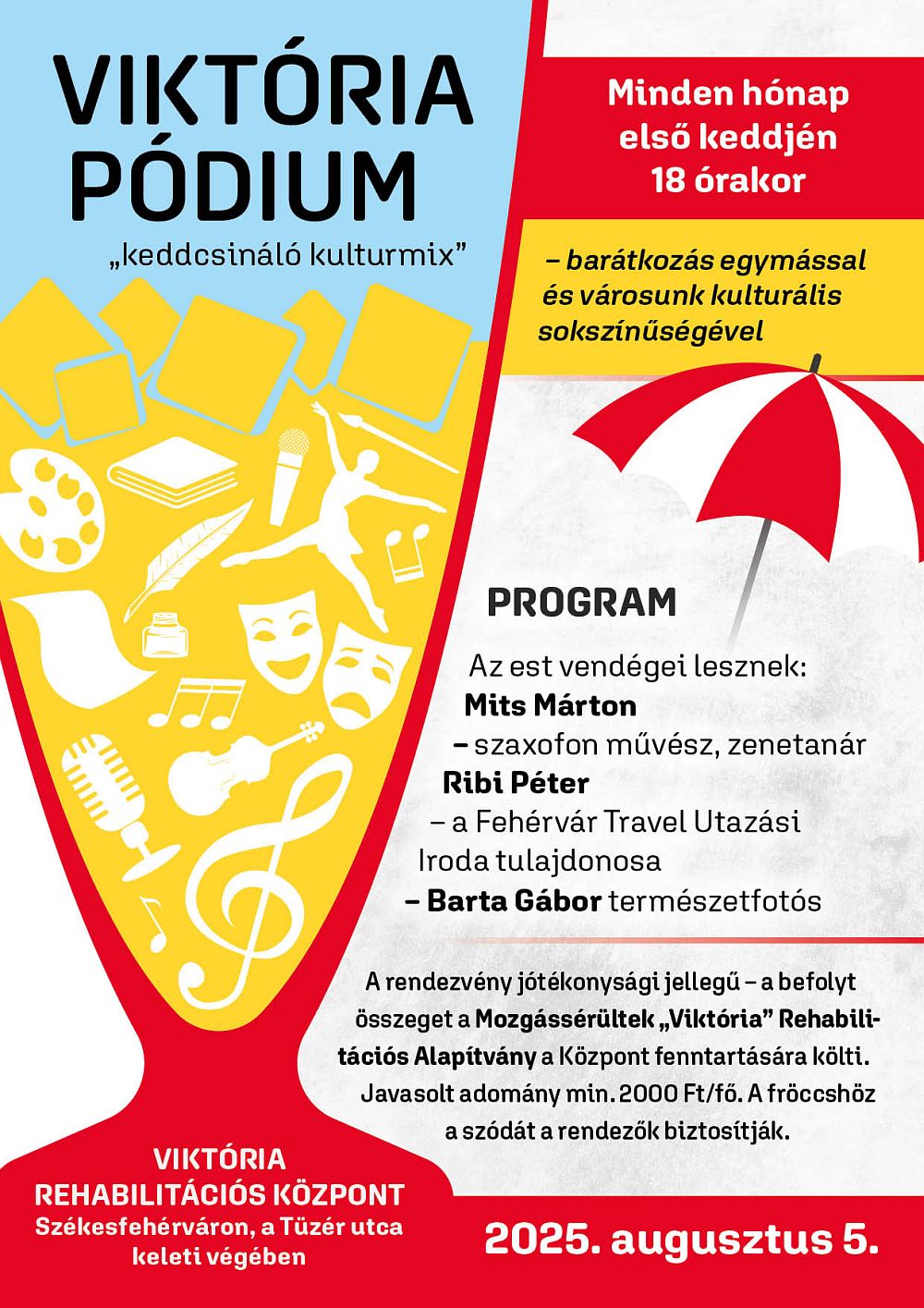 Augusztus 5-én kedden 18 órától folytatódik a „keddcsináló kulturmix” alcímet viselő Viktória Pódium sorozata. Ezúttal Mits Márton szaxofonművész, zenetanár, Ribi Péter, a Fehérvár Travel Utazási Iroda tulajdonosa, valamint Barta Gábor természetfotós lesz az est vendége.