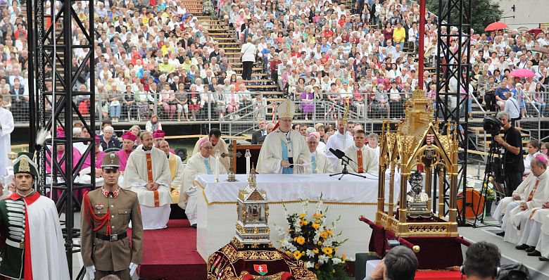 Augusztus 14-én egy különleges autóval, a Nemzeti Bank páncélozott járművével, különleges biztonsági körülmények között érkezett meg a Szent Jobb, Szent István városába. A Bazilikában egész nap bárki tiszteletét tehett az ereklye előtt. Délután a középkori Magyarország szakrális központjában, a Szűz Mária királyi prépostsági templom maradványait őrző Nemzeti Emlékhelyen Erdő Péter bíboros, prímás, az Esztergom-Budapesti Főegyházmegye érseke koncelebrált ünnepi szentmisét Alberto Bottari de Castello apostoli nunciussal és a Magyar Katolikus Püspöki Konferencia tagjaival mintegy négyezer ember előtt.