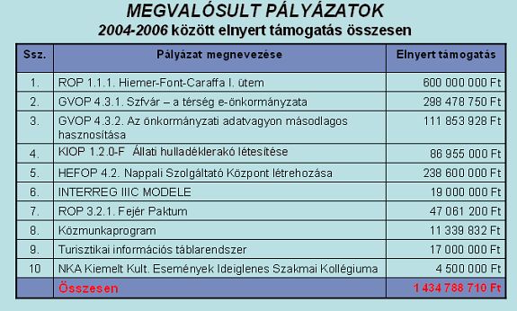 A Hiemer-ház első ütemének felújítása tavaly hét hónap alatt fejeződött be, amire 600 millió forintos támogatást nyert Székesfehérvár a Regionális Operatív Program pályázaton, Turisztikai Vonzerő Fejlesztésére. Az önkormányzat információ-szolgáltató tevékenységének fejlesztése révén újult meg Székesfehérvár internetes oldala, amin e-közigazgatási funkciók is helyet kaptak, illetve Székesfehérvár Önkormányzata adatvagyonának másodlagos hasznosítása is elkészült. Ennek eredménye, hogy a térinformatikai rendszerrel sikerült támogatást nyújtani a kis- és közép vállalkozásoknak illetve az itt lakóknak. Ezekre a programokra több mint 410 millió forintot nyert a város. Az állati hulladékok kistérségi szintű kezelési rendszerének kialakítása, infrastruktúra fejlesztése a székesfehérvári kistérség területén pályázat által 86 milliós beruházás fejeződik be a város határában, így a gyepmesteri telep modern, korszerű állati hulladékgyűjtő- és átrakó teleppé válik. A Nappali Szolgáltató Centrum megépítésére 238 millió forintot nyert az önkormányzat a társadalmi befogadást támogató szolgáltatások infrastrukturális fejlesztése céljából. A Vállalkozói Információs Központot is pályázaton elnyert pénzből valósította meg a város az Inkubátorházban, erre 19 millió forintnyi pénzt nyertek, míg a Partnerség a Fejéri foglalkoztatási helyzet javításáért programon 47 millió forinttal segíti a város a megye déli részén a munkanélküliség csökkentését. A közmunkaprogramban 41 embert tudott a Városgondnokság foglalkoztatni az idén, amire több mint 11 millió forntnyi pályázati pénz érkezett. A nemrégiben elkészült a Turisztikai információs táblarendszer, így a városban összesen 205 oszlop került telepítésre, amire megközelítőleg 500 táblát szereltek fel. A programra 17 millió forintnyi támogatást nyert Székesfehérvár. A sajtótájékoztatón az is elhangzott, hogy az idén a nyári programokra is nyert pályázati pénzt az önkormányzat, amiből a Harmonia Albensist, a Musica Regiat és a Királyi Napokat támogatta a város.