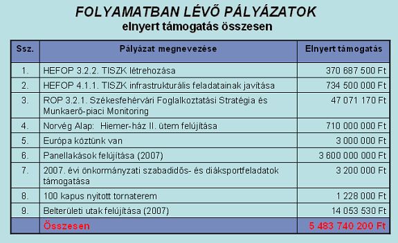 A pályázati önrész biztosítására szóló önerő alapból mintegy 83 millió forintnyi elnyert támogatás érkezett Székesfehérvárra. A folyamatban lévő pályázatok kapcsán elhangzott, hogy jelenleg 5.4 milliárd forint felhasználása folyik Székesfehérváron. A Térségi Integrált Szakképző Központ megvalósítására 370 és 730 millió forintot nyert a város, amiből jól felszerelt, korszerű tanműhelyeket alakítottak ki az informatika, gépészet, kereskedelem-marketing és elektronika-elektrotechnika szakmacsoportok képzésére.
