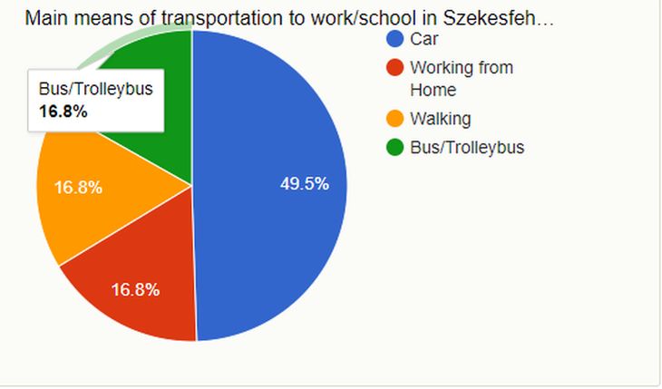 Érdekes különbségek mutatkoznak a közlekedés tekintetében, amit azonban nem tekinthetünk reprezentatívnak, az adatközlők alacsony száma miatt. A Numbeo statisztikái szerint a fő közlekedési eszköz a munkába vagy az iskolába járásra Székesfehérváron az autó (50%), míg busszal, vagy gyalog a megkérdezettek 16-17%-a jut el reggel a célállomásra. A Numbeo becslései szerint Székesfehérváron a munkába/iskolába járás miatt minden utas évente 839,62 kg CO2-t termel. Minden egyes utasra 38,57 fa szükséges ahhoz, hogy elegendő oxigént termeljen. A Numbeo szerint Győrben a legtöbben gyalog közlekednek, a második helyen a busz következik és csak a harmadik helyen szerepel az autó. Székesfehérváron egy munkába közlekedő autós átlagban mindössze 7,33 km-t tesz meg és 21 perc alatt ér be a munkahelyére, Győrben az autósok nagyobb távolságra – átlagban 15km-re – mennek és szintén 20 perc alatt érnek be.