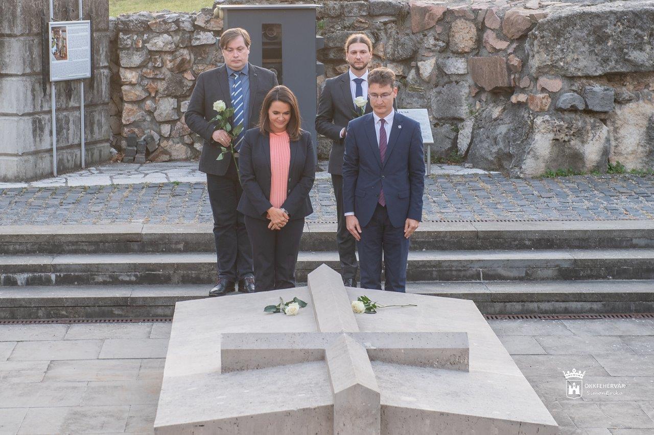 Programja keretében a köztársasági elnök pénteken a késő délutáni órákban érkezett vissza Székesfehérvárra, ahol elsőként a Nemzeti Emlékhelyen az Osszáriumnál helyezte el az emlékezés virágait dr. Cser-Palkovics András polgármesterrel, Róth Péter alpolgármesterrel és Pokroveszki Krisztiánnal, a Szent István Király Múzeum főigazgatójával közösen.