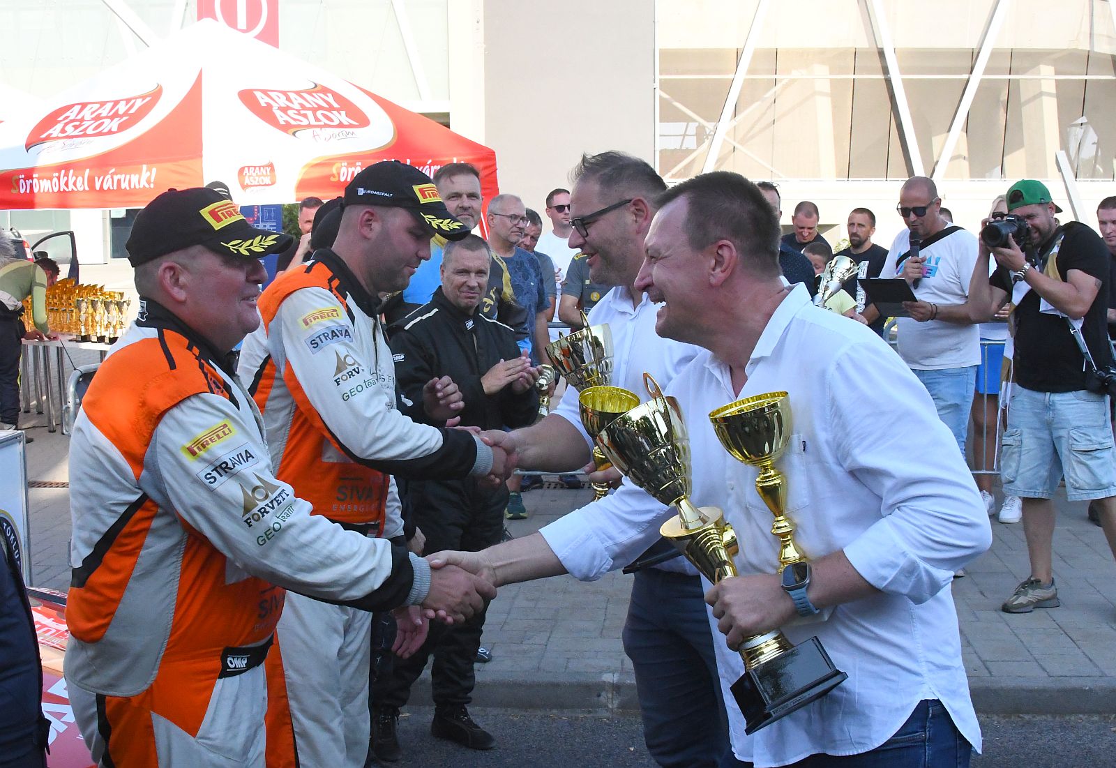 A Székesfehérvár Rallye kupáit Szujó Zoltán az MNASZ elnöke és Mészáros Attila Fehérvár alpolgármestere közösen adták át vasárnap este a Sóstói Stadion előtt.
